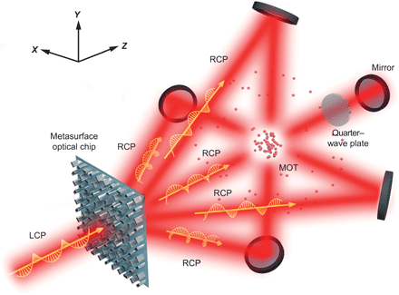 量子无源导航系统中,量子导航传感器、计时器是核心模块,它们的性能直接影响系统的导航能力。202086日,由伯明翰大学领导的英国量子技术中心传感器与授时领域的研究人员设计一种使量子传感系统小型化的方法,使用光学超表面来减少激光传输系统的尺寸,其介电超表面光学芯片冷原子装置如图5所示,该研究发表于《科学进展》。