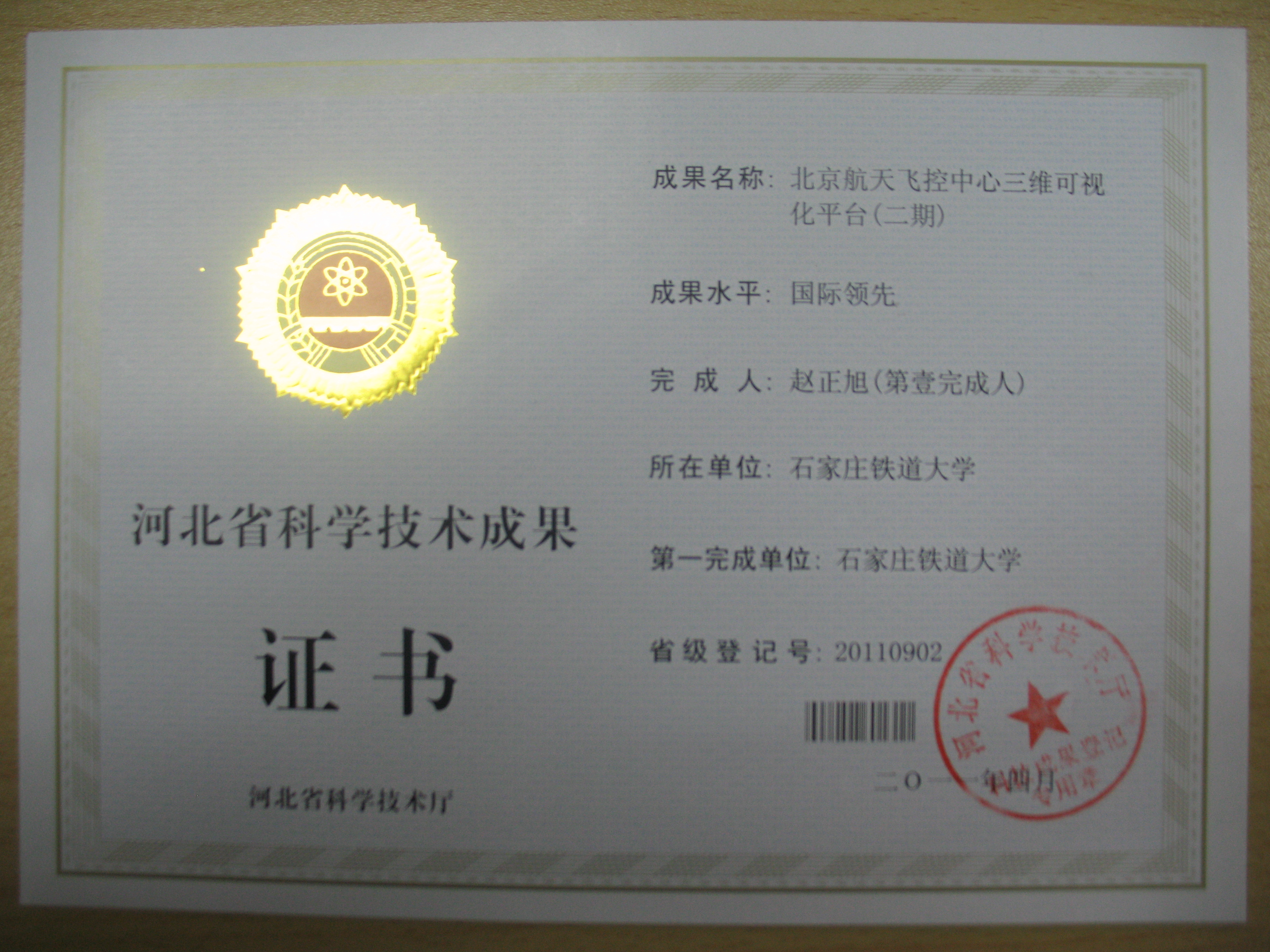 《北京航天飞控中心三维可视化平台(二期)》河北省科学技术成果证书-赵正旭