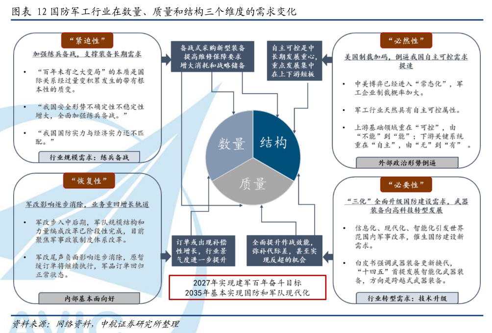 《中共中央关于制定国民经济和社会发展第十四个五年规划和2035年远景目标的建议》提出,2027年实现建军百年奋斗目标,2035年基本实现国防和军队现代化。面对百年未有之大变局,在外部形势倒逼和内部基本面向好的内外双重促进下,在练兵备战和技术升级紧迫需求的双重牵引下,在当前我国国防实力与经济实力还不匹配的现实矛盾下,我国国防建设和军工行业发展将迎来规模性快速增长和结构性转型升级,军工行业在数量、质量和结构三个维度都将迎来实质性的重大变化和历史性的发展机遇。