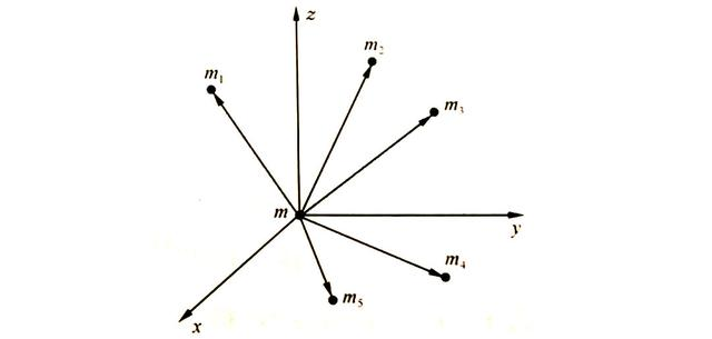 牛顿一开始就意识到了这个问题,后来,他给出了严格的证明。即多质点体系的引力问题。我们现在在空间中建立一个坐标系,在原点处有一个质量为m的质点,空间中分布着质量分别为m1、m2、m3、……、