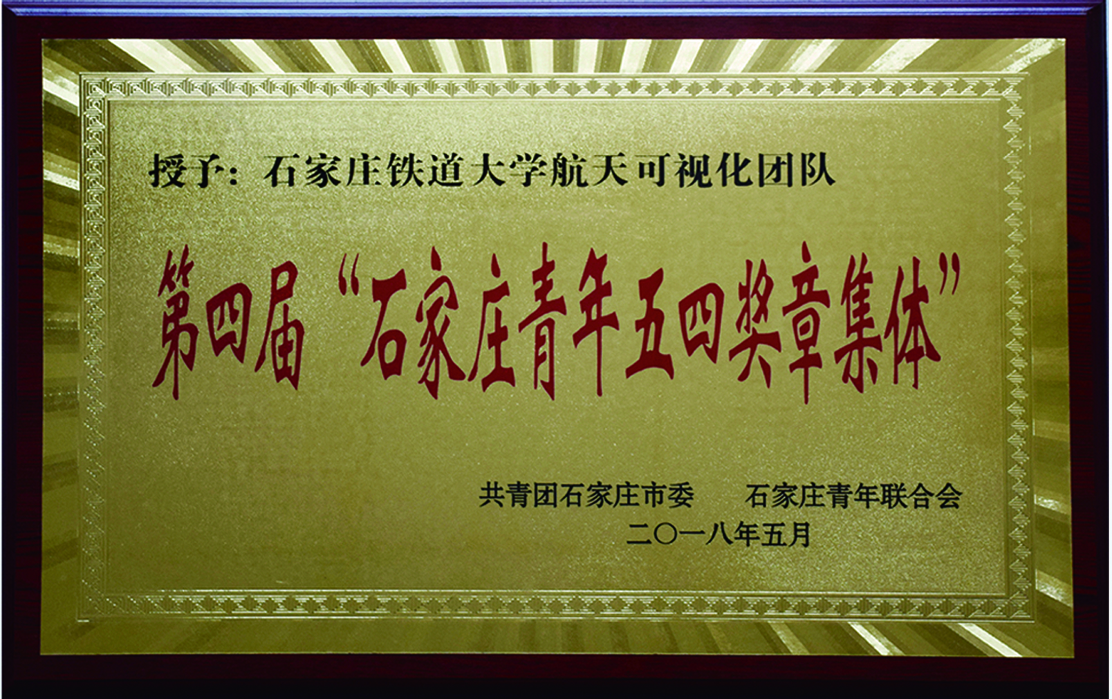 第四届“石家庄青年五四奖章集体”荣誉 2018年4月28日,复杂网络与可视化研究所航天可视化团队从45个团队中脱颖而出,被共青团石家庄市委、石家庄市青年联合会授予第四届“石家庄青年五四奖章集体”荣誉称号;5月8日,在石家庄市青年五四奖章(集体)表彰暨座谈会上,复杂网络与可视化研究所航天可视化团队受到表彰并颁发了奖牌。 附件: 第四届“石家庄青年五四奖章集体”荣誉.jpg