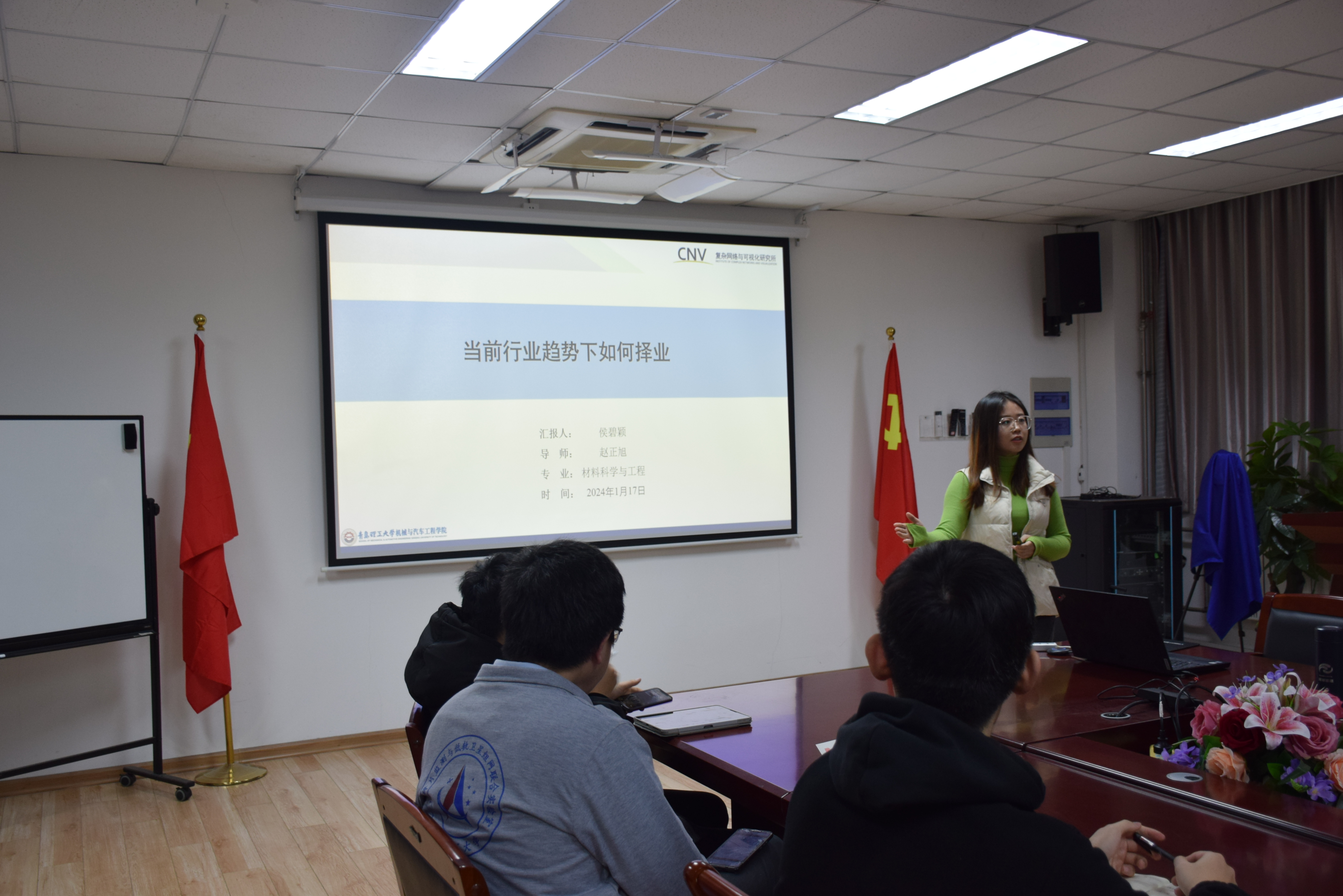 首先,2021级硕士研究生赵亚楠对她的硕士毕业论文撰写情况进行汇报,提出了目前研究存在的问题及解决方法,以及下一步的工作计划;其次,2022级硕士研究生侯碧颖分享了当前行业趋势下如何择业的问题。