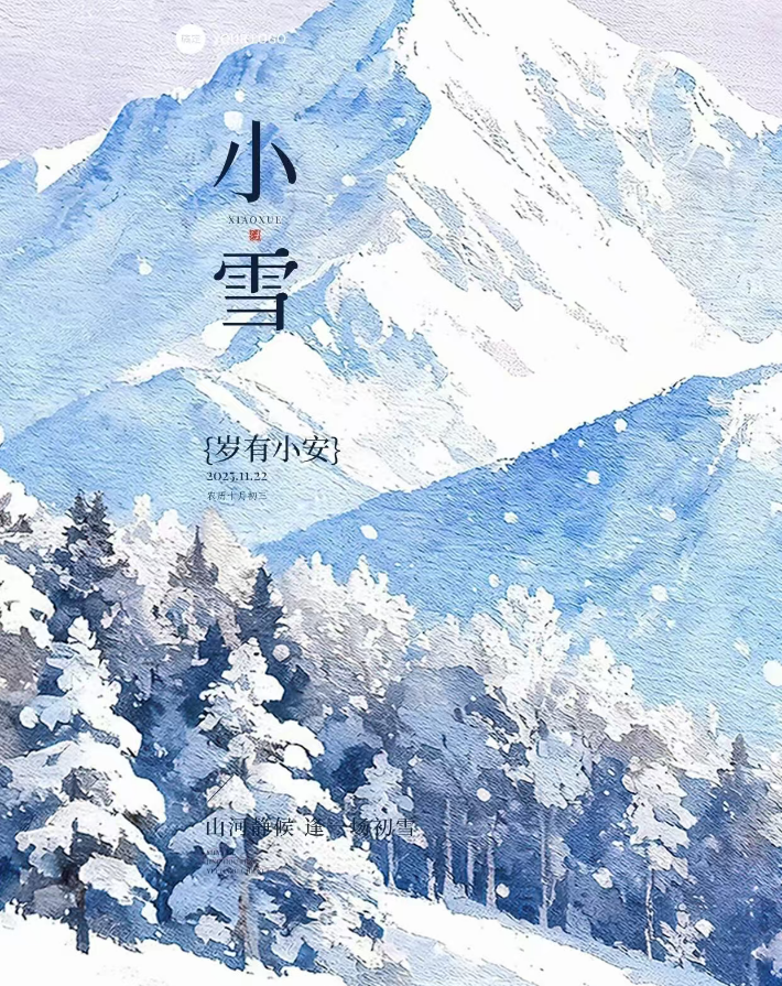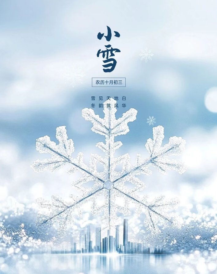 今日是2025年11月22日,星期六,农历乙巳年十月初三,十一时零四分,迎来小雪节气。小雪是一年的第二十和冬季的第二节气,太阳位于黄经240°度,斗柄指亥时。《群芳谱》中说:“小雪气寒而将雪矣,地寒未甚而雪未大也。”此时降水形式由雨变为雪,但雪量不大,故称小雪。小雪时节北风渐劲,初雪或临,万物冬藏,天地寒凉,即使不下雪,也难得晴天。人们常常隐约感觉到,雪正在悄悄酝酿之中。