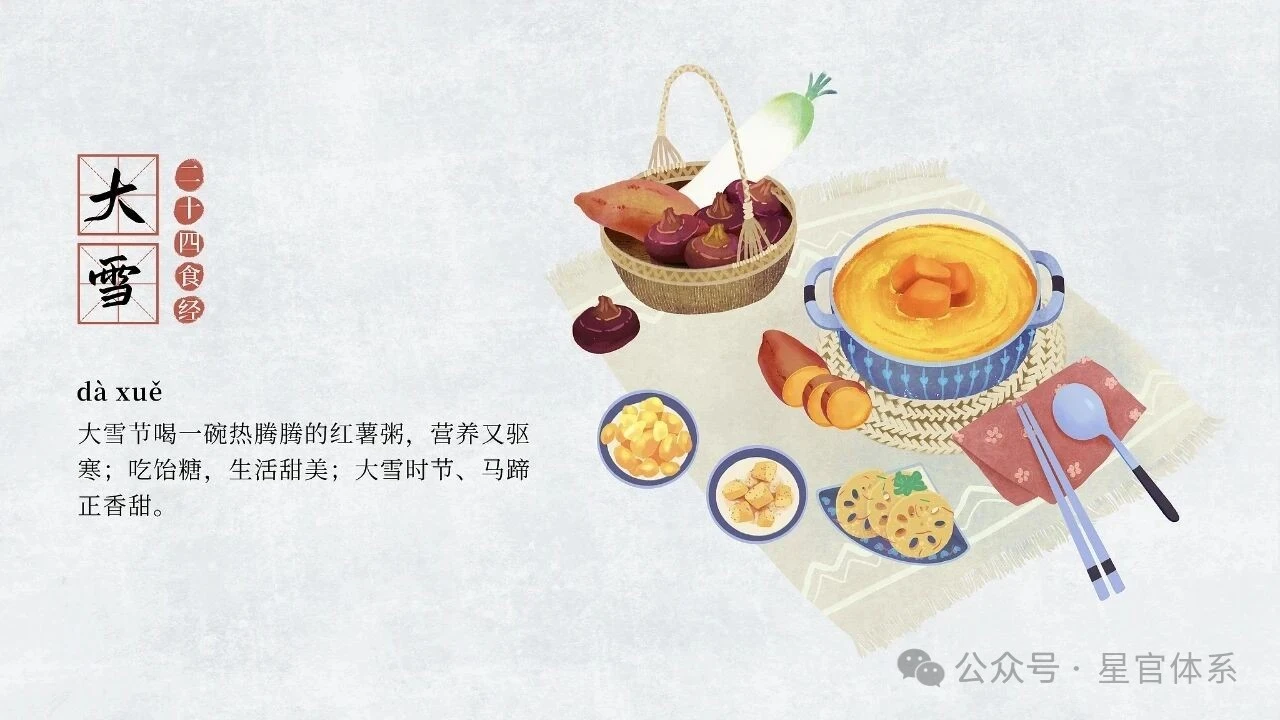 大雪节气,家家户户忙着腌制腊肉、水产等咸货,灌香肠、制火腿,挂晒风干,以迎新年。北方很多地区有大雪吃饴糖习俗。“铴锣一敲,甘甜如饴。”饴糖由玉米、大麦、小麦、粟或玉蜀黍等粮食经发酵糖化制成,可补中缓急、润肺止咳。鲁北民间有大雪喝红薯粥的习俗,可暖身养胃,增强免疫。大雪进补宜温补助阳、补肾壮骨、养阴益精,可食用羊肉、牛肉、鲫鱼、海参、核桃、枸杞、雪藕、雪梨、雪菜、红薯、柑橘、柚子等富含蛋白质、维生素且易消化的食物,以驱寒暖身、提升免疫、促进代谢。