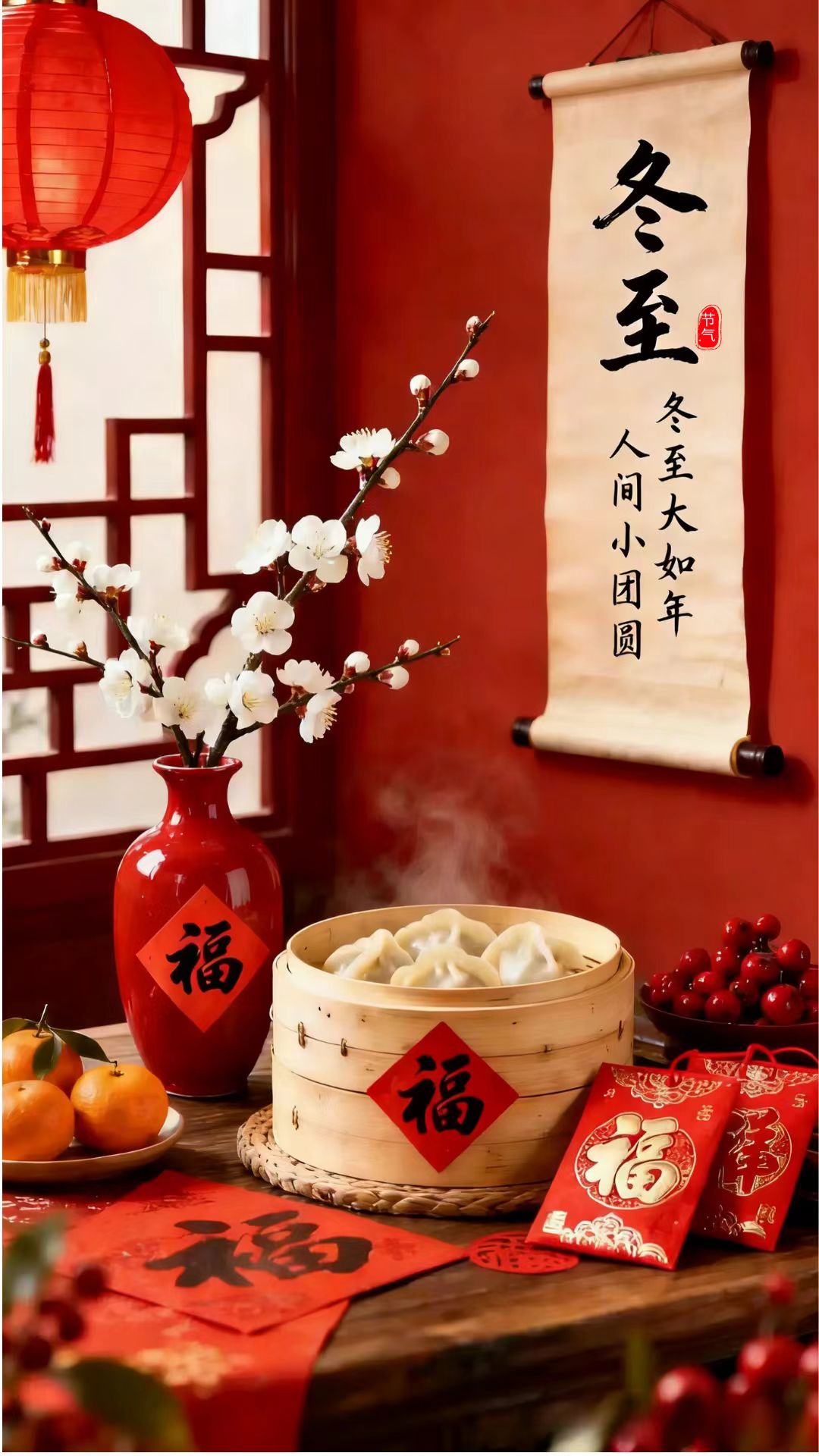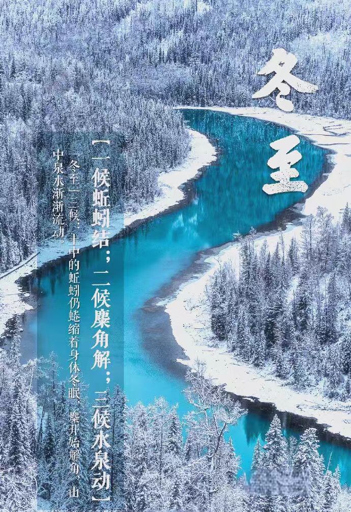 冬至不仅是中国农历中的重要节气,也是中华民族的传统节日。民间有“冬至大如年”的说法。从阴阳相生的角度来看,冬至被古人视为阴消阳长的关键节气。冬至是华夏民族在上古时期天文历法中所创立的二分二至中的一至,是大节日。很多地方有祭祖和宴饮习俗。今年的冬至更是特殊,可以说是“六十年一遇”之日:其一,为甲子日,是干支纪日历法系统的起点,每60天出现一次;其二,是十二建星中第一星代表的建日;其三,为一年一遇的天赦日,是民间流传的消灾解厄的吉日。我国北方冬至这天有吃饺子的习俗,因为冬至前后北方已经是天寒地冻了,而饺子长的像耳朵,所以民间流传着“冬至不端饺子碗,冻掉耳朵没人管”的说法;我国南方则吃汤圆,寓意团团圆圆、家庭和谐。竹屋消残半瓦霜,冰河冻裂一渔航。时光流逝如溪河,岁月辗转作成歌;冬至入寒岁渐晚,风冷冰成冬月天;冬夏春秋安无恙,惟愿来日更方长。冬至福至,吉祥如意!