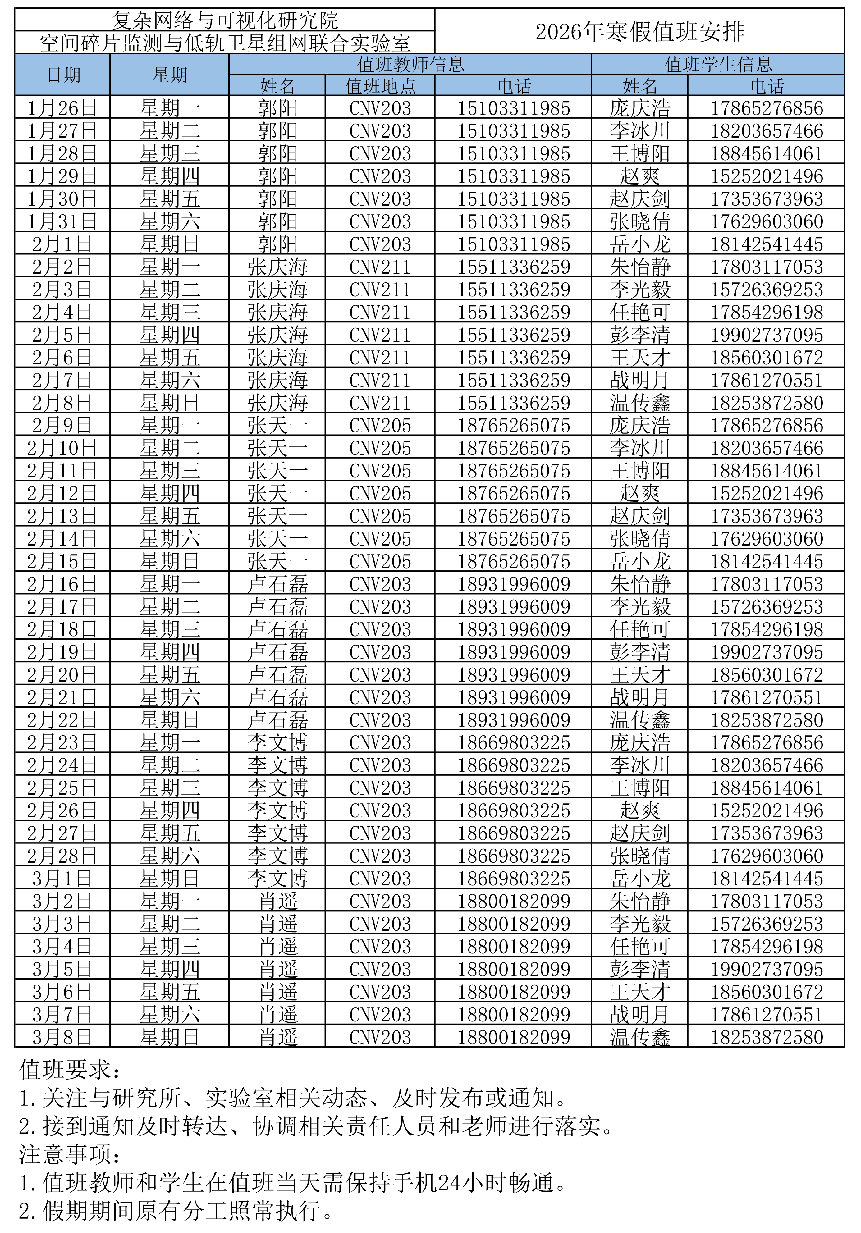 复杂网络与可视化研究院2026年寒假值班安排
